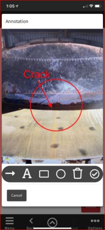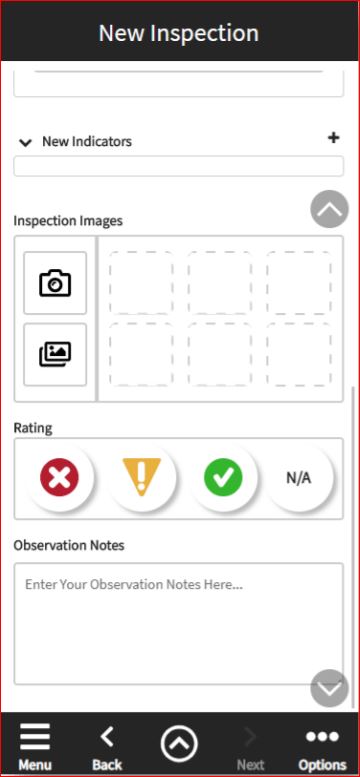 COMPLETE THE INSPECTION RECORD Once all the data measurements have been captured (if applicable) use the fast scroll buttons to navigate to the bottom of the page to complete the inspection record by capturing any images, adding an inspection rating and recording any notes. Inspection Images – Tap the appropriate icon to either take a new photo using the camera or select a previously captured photo that is in the camera roll. See below for more detail. Rating – Select the correct observation rating. See below for more detail. Observation Notes – Enter notes related to this observation. Once all fields have valid entries, you can either tap the Next arrow in the footer to advance to the next page to submit the observation/s, or tap the Quick Access Menu and choose Add Observation button to add another component observation for the current asset inspection. |