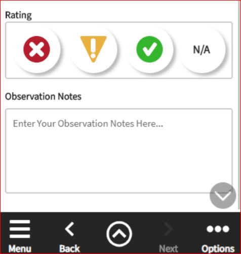 SELECT THE OBSERVATION RATING N/A can be selected if: • The inspection is not possible due to the position of the component. • Operator is not available to place equipment in correct position. • It is not safe to inspect the equipment based on risk assessment. |
