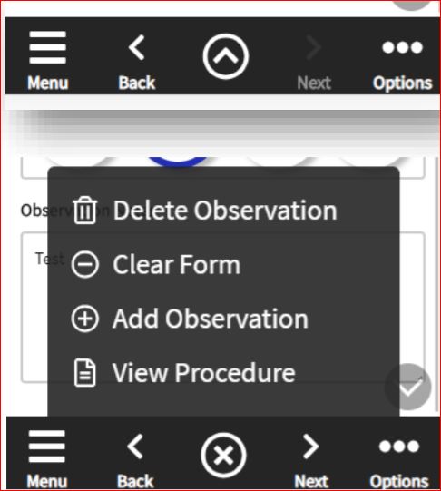 | QUICK ACCESS MENU The Quick Access menu is available at the bottom of each screen (up arrow to the right of Back). It is used to access context specific options as per below • Delete Observation - If you want to delete the current observation you are creating, tap the Delete Observation option • Clear Form – This will clear the contents of the current screen so you can start again • Add Observation – From screen 2, you can choose to add another observation for the same Asset & Component • View Procedure – if the currently selected Component has an inspection procedure document linked in the Component Profile screen in Trakka, it is viewable in the app by using this option. If the menu item is greyed out it means no document is available for this component and observation type. Procedure documents can be added in Trakka in the Component Profile detail form in Trakka. In the Condition Monitoring tab, create a row record for the Observation type and add the procedure in the Document field. |