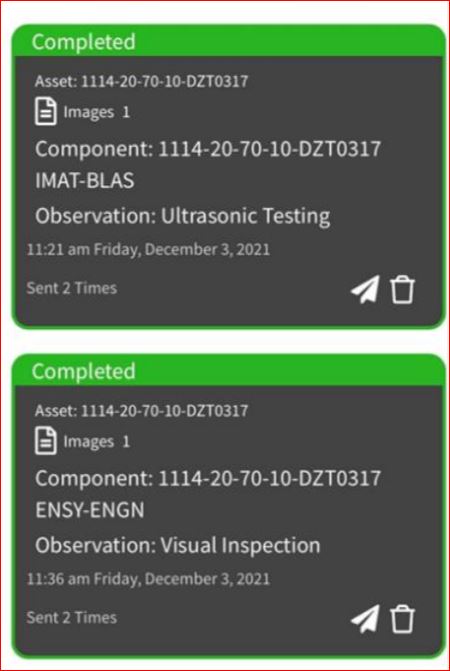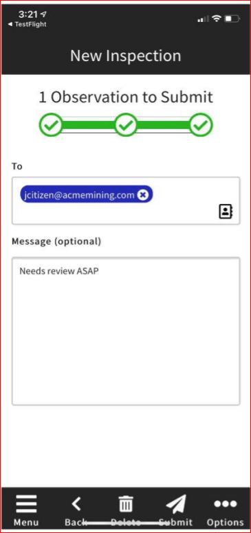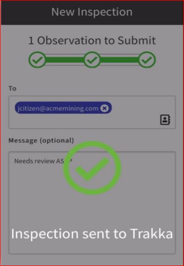 SUBMIT THE OBSERVATION(S) Once all Observations have been completed for the Inspection, they can be submitted to Trakka. To – This field is prepopulated with the distribution list recorded in Trakka. This list is maintained on the Asset record in Trakka on the Inspection App Linked Persons tab. Each person can select which Ratings they want to receive emails for by configuring their selection In Profiles & Lists > Persons Responsible You can also type in additional email addresses or select them from the devices contact list. Any email address recorded here will receive a HTML email report of the inspection details. ![]() Message – Add any additional messages that you want to appear on the HTML email report. If you need to go back and edit anything, use the Back button at the bottom of the screen. Once everything is ready, submit the observation/s by tapping the Submit button. Once the Inspection is successfully processed, you will see a message noting that Inspections were sent to Trakka. ©2022 DINGO Software Pty. Ltd. |
