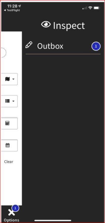 | OPTIONS Submitted Inspections are sent via the Outbox. The Outbox can be found under the Options menu (bottom right corner). You can see the progress of Inspection submissions by going to the Outbox where the number of observations are shown in a blue circle. Once the app is connected to the internet, it will send the Inspections to Trakka immediately and the records in the Outbox will be cleared. ![]() |
