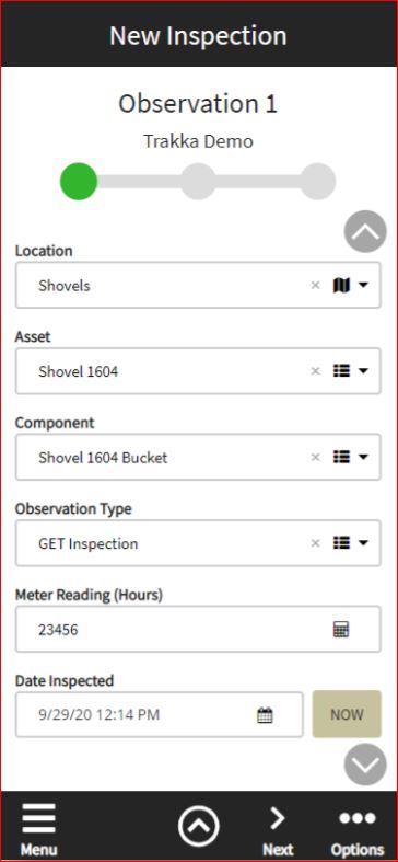 SELECT THE COMPONENT AND OBSERVATION TYPE The first screen of a new inspection record is for entering information about the Asset and Component being inspected as well as the observation type for the data being collected. You must complete all fields before you can move to the next screen: |